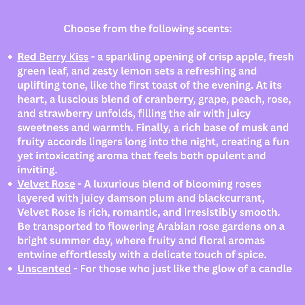 Our lovely Friendship Candles are hand-poured from natural soy wax and come in a choice of 2 very beautiful scents Red Berry Kiss and Velvet Rose. Or if you just prefer the simple glow of a candle we have them in Unscented as well.
